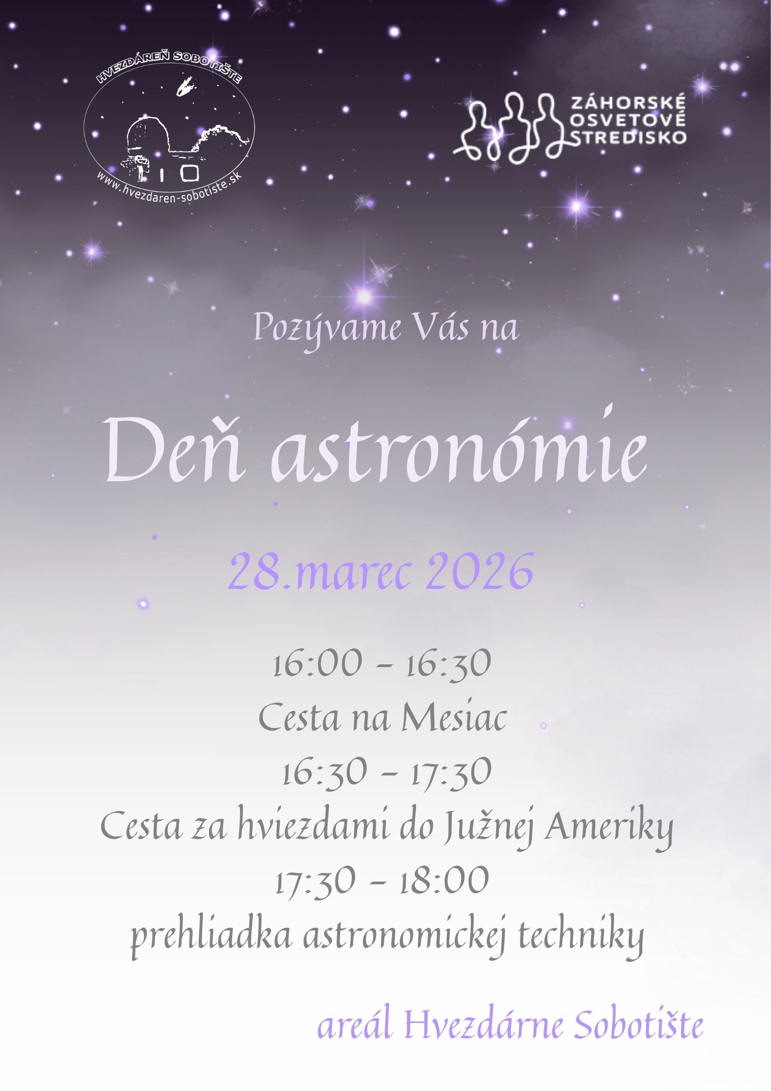 Deň astronómie 2026 sa bude niesť v znamení cestovania. Najskôr to bude prednáška o plánovanej ceste ľudskej posádky na Mesiac v rámci programu Artemis. V ďalšej časti sa vyberieme do ESO – Európskych južných observatórií v Chile, ktoré nám prinášajú nové informácie o bližšom i vzdialenejšom vesmíre. No a v závere to bude prehliadka astronomickej techniky využívanej pri práci v astronomických krúžkoch i verejných pozorovaniach oblohy.
